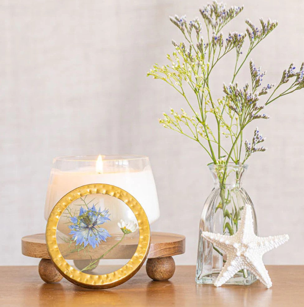 Bring coastal tranquility into your space with this beautifully crafted accent candle. Delicate pressed flowers are suspended in wax, creating an elegant visual centerpiece that complements any room's décor. The fresh sea salt mist fragrance evokes the crisp, rejuvenating scent of ocean air—perfect for creating a calming atmosphere. Ideal for adding a touch of natural beauty and subtle aromatics to shelves, nightstands, or living areas. A thoughtful gift for anyone who loves coastal-inspired home accents.