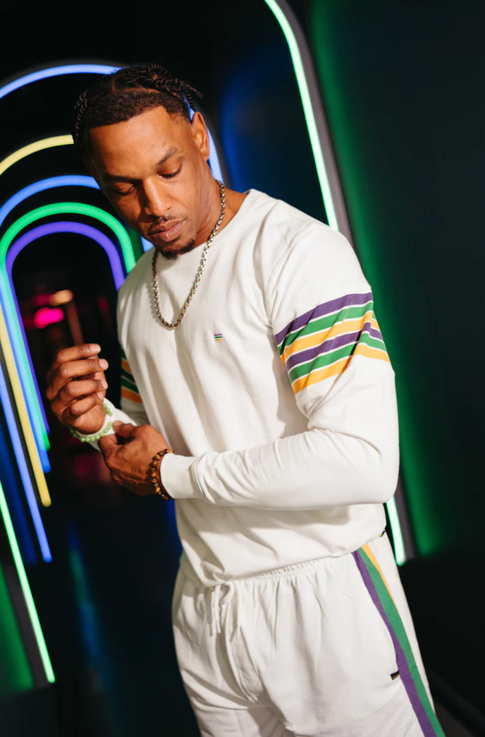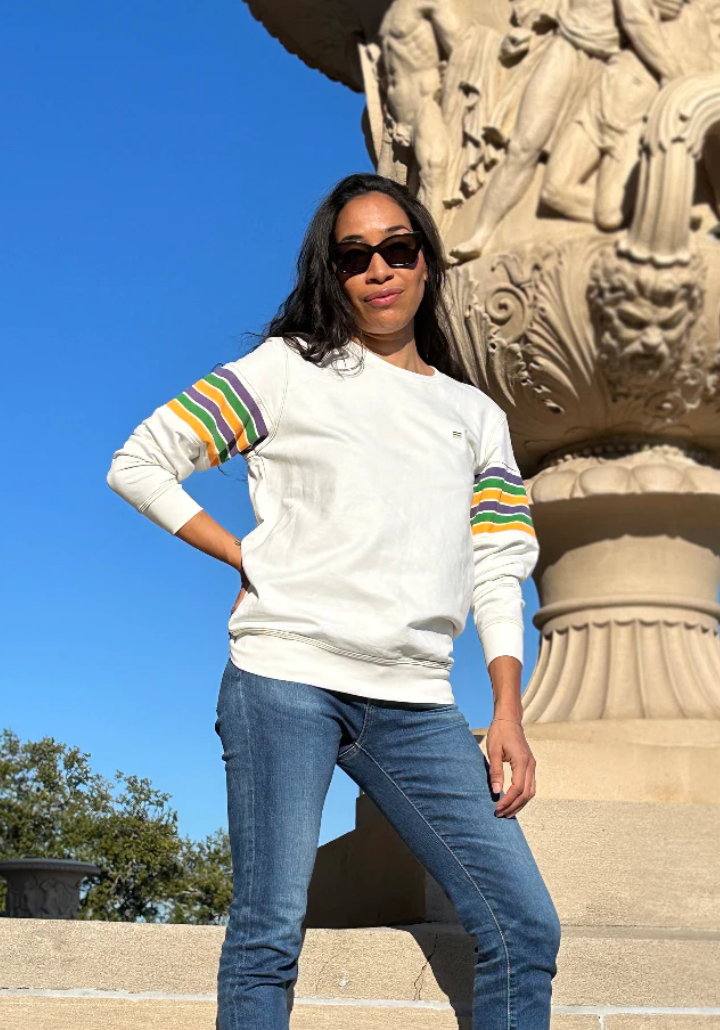 Embrace the spirit of celebration with this striking French terry pullover, featuring bold vintage-inspired arm stripes that capture the vibrant energy of Mardi Gras. Crafted from soft, breathable French terry fabric, this off-white base provides the perfect canvas for eye-catching color blocking that demands attention. The relaxed pullover silhouette offers comfort without sacrificing style, making it an ideal choice for casual outings or festival-ready looks. Whether you're channeling retro flair or adding a pop of personality to your everyday wardrobe, this piece delivers distinctive character that sets you apart from the crowd.