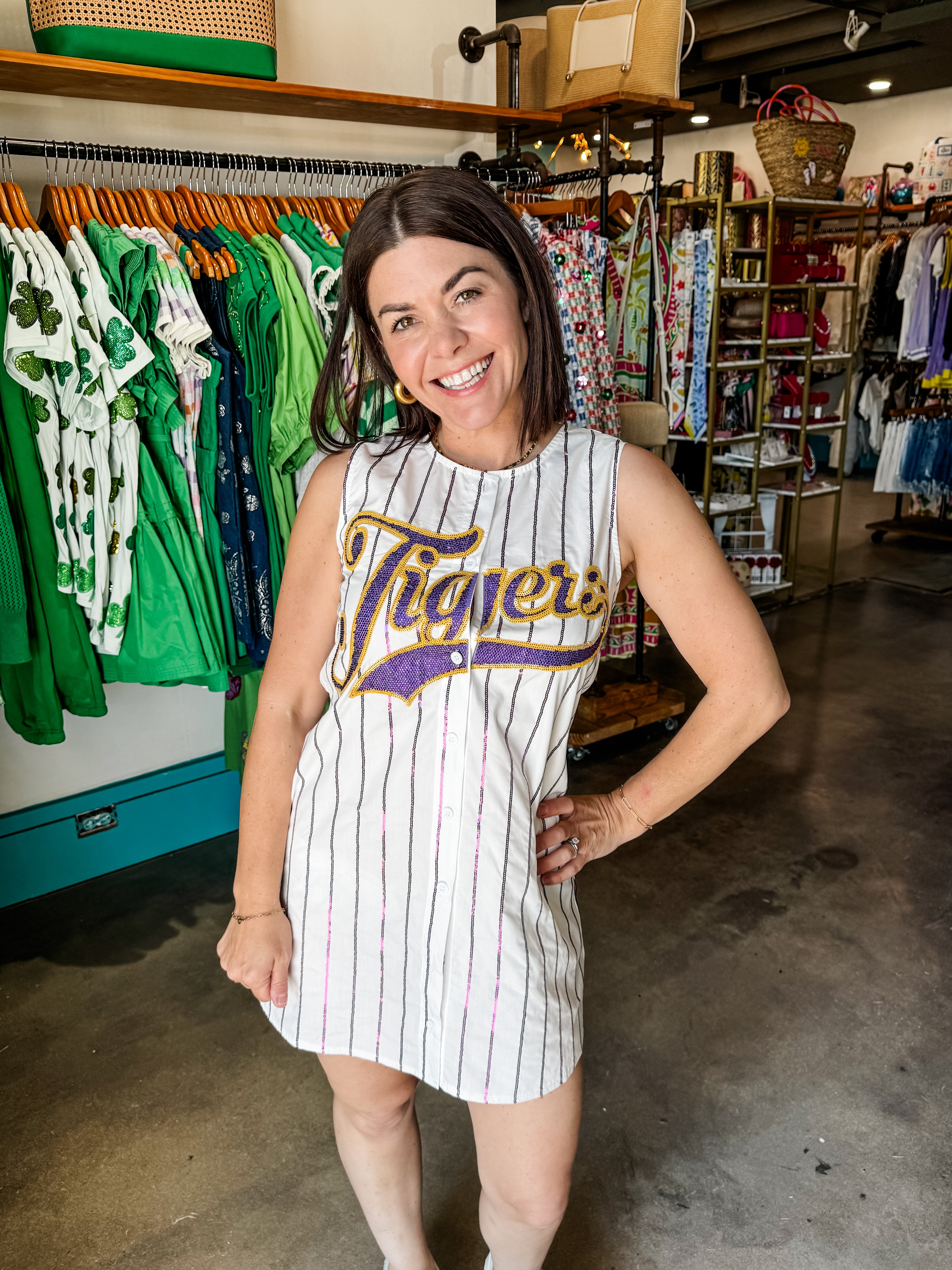 Celebrate your LSU pride with this officially licensed striped cotton baseball tank dress. Featuring classic team colors in a comfortable striped pattern, this versatile piece transitions effortlessly from game day to casual outings. The relaxed tank silhouette offers breathable comfort perfect for warm weather, while the dress length provides easy styling options. Whether you're cheering in the stands or showing your school spirit around town, this authentic LSU piece is a must-have for any fan's wardrobe. Also available at our Baton Rouge, LA location!