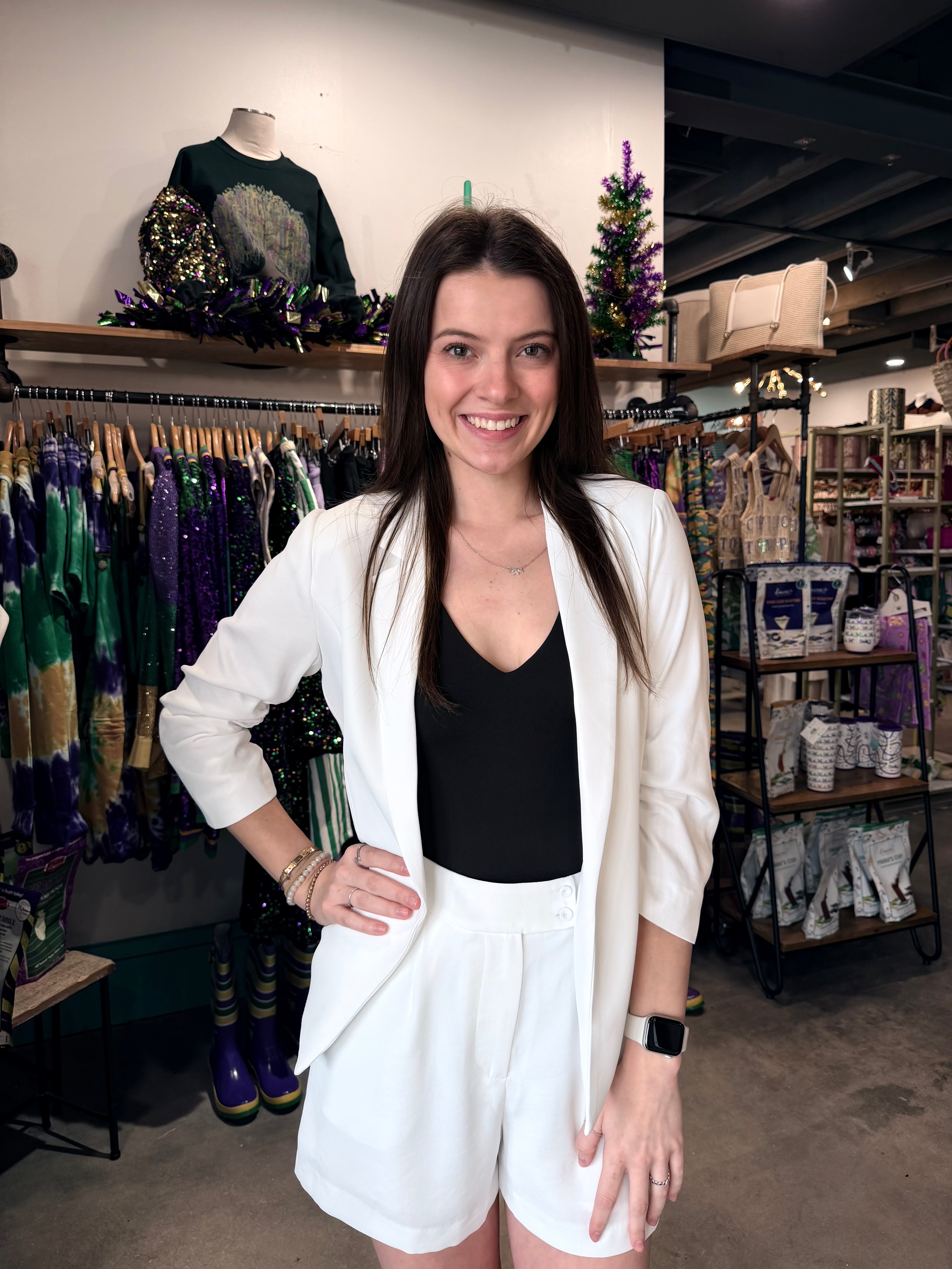 Elevate your workwear with this crisp white blazer featuring distinctive shirred sleeves that add modern sophistication to any outfit. The structured silhouette flatters your frame while the textured sleeve detail creates visual interest and sets you apart from standard blazers. Perfect for the office, client meetings, or weekend styling, this versatile piece transitions seamlessly from professional to polished casual. Layer it over your favorite dress or pair with tailored trousers for an instantly put-together look that commands confidence and style.