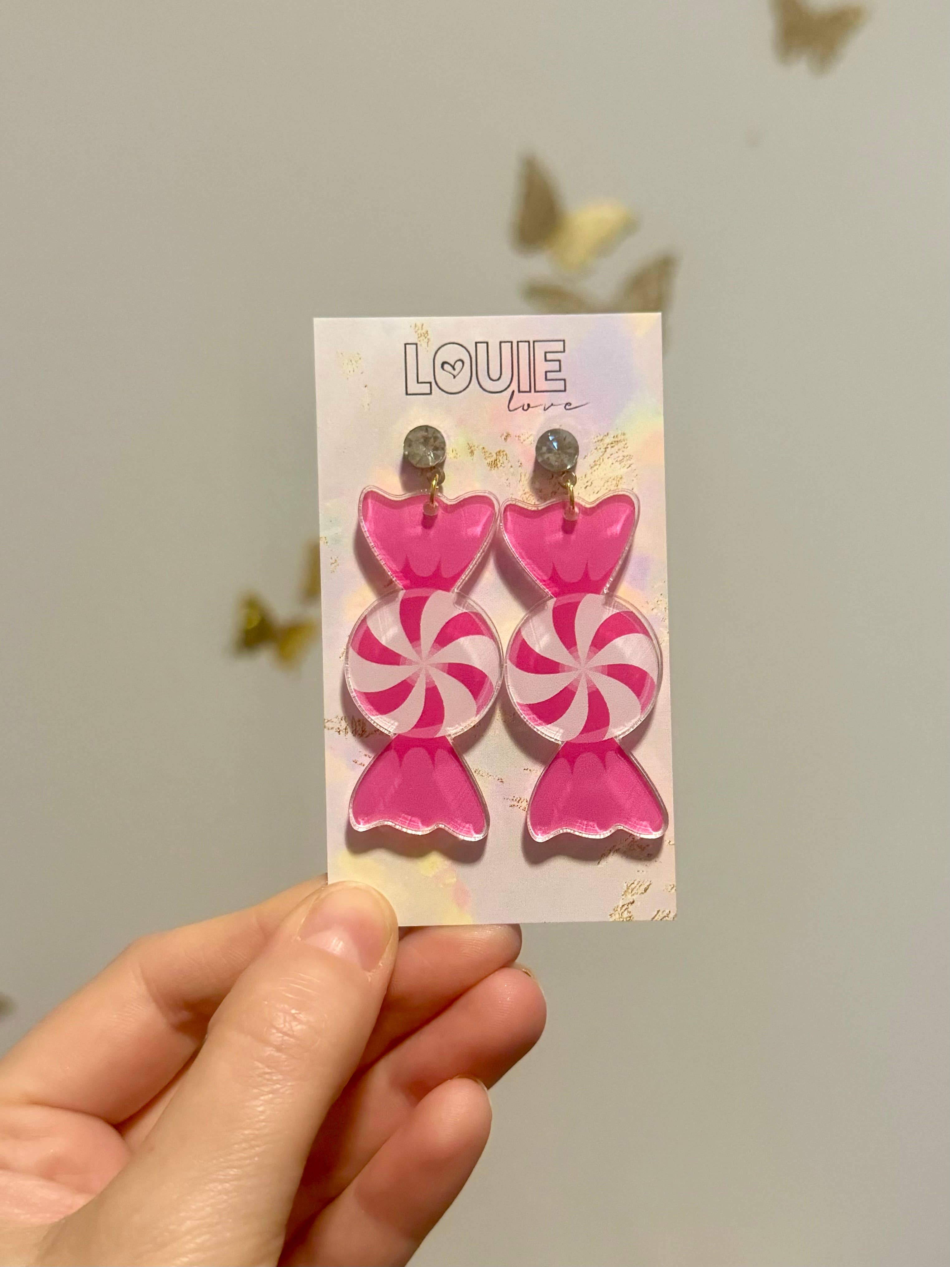 Louie Love Acrylic Pink Christmas Candy Cane Festive Earrings