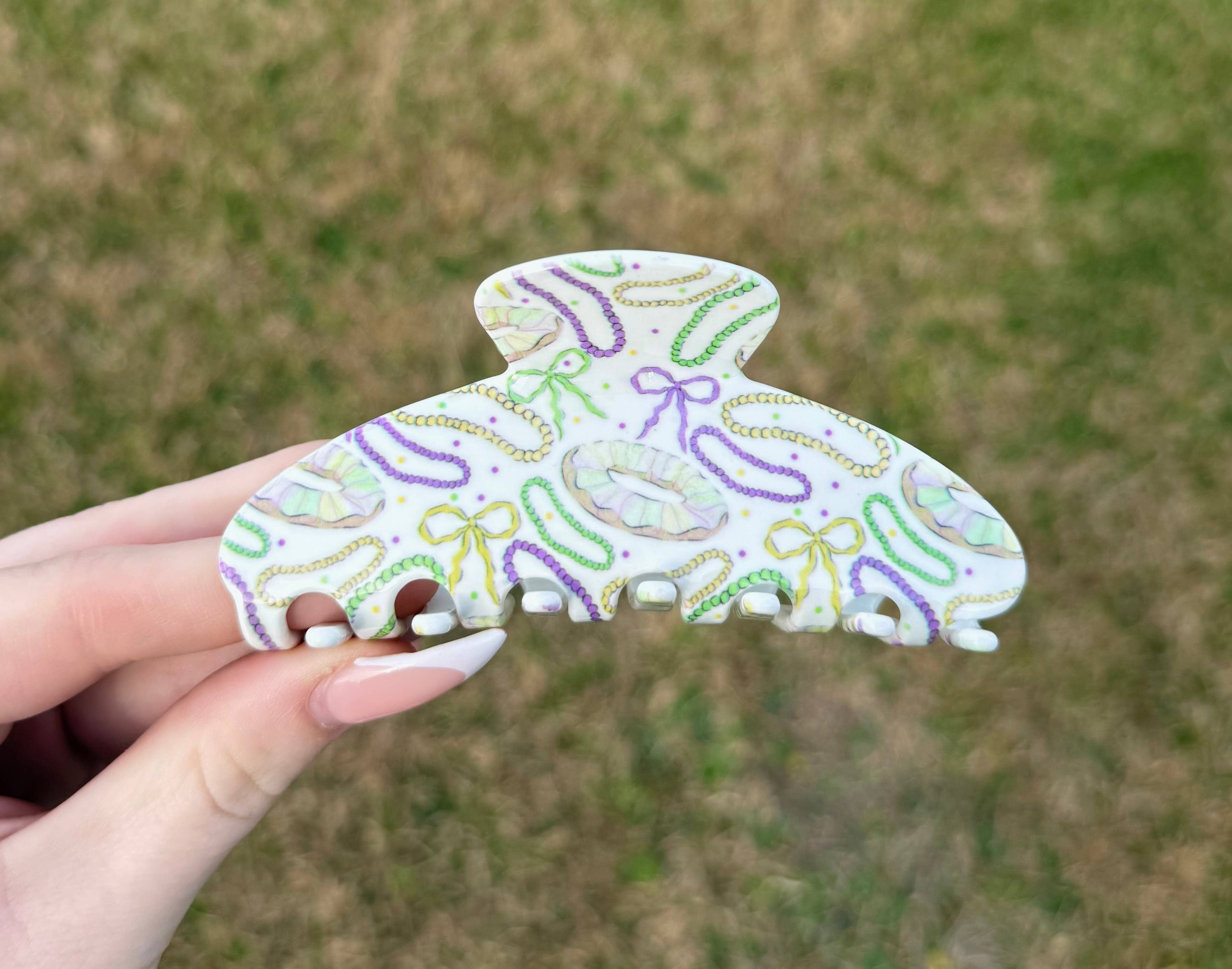 Indulge in Mardi Gras magic with this delightful La Luna Belle King Cake Design claw clip. Inspired by the iconic treat of the season, this clip features intricate beadwork that captures the rich colors and festive spirit of New Orleans tradition. Beyond its stunning appearance, the reliable claw grip secures your hair effortlessly, keeping you polished from morning through night. Whether you're celebrating Carnival season or simply craving a touch of seasonal flair, this accessory delivers both style and substance. Make every day feel like a celebration with this charming, conversation-starting piece that showcases your love for festival fashion.