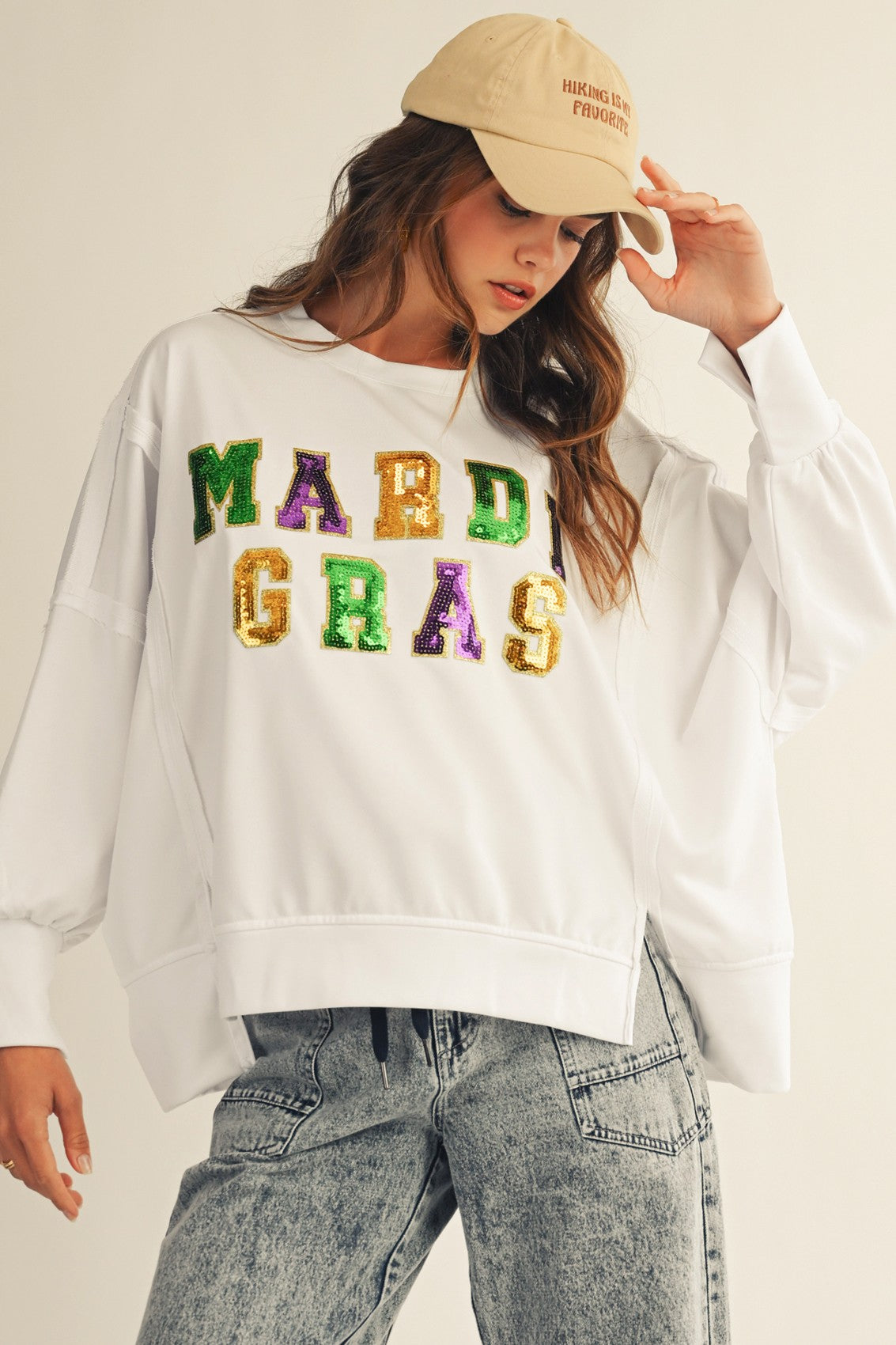 Radiate elegance with this ivory sequin Mardi Gras loose fit top that brings understated glamour to your celebration wardrobe. The delicate sequins shimmer softly against the ivory backdrop, creating a sophisticated yet festive look that works for parties and special occasions alike. The relaxed loose fit ensures all-day comfort while the neutral ivory tone pairs effortlessly with any bottoms. Make a graceful statement without sacrificing comfort—this top delivers the perfect balance of sparkle and wearability for anyone seeking refined festive style.