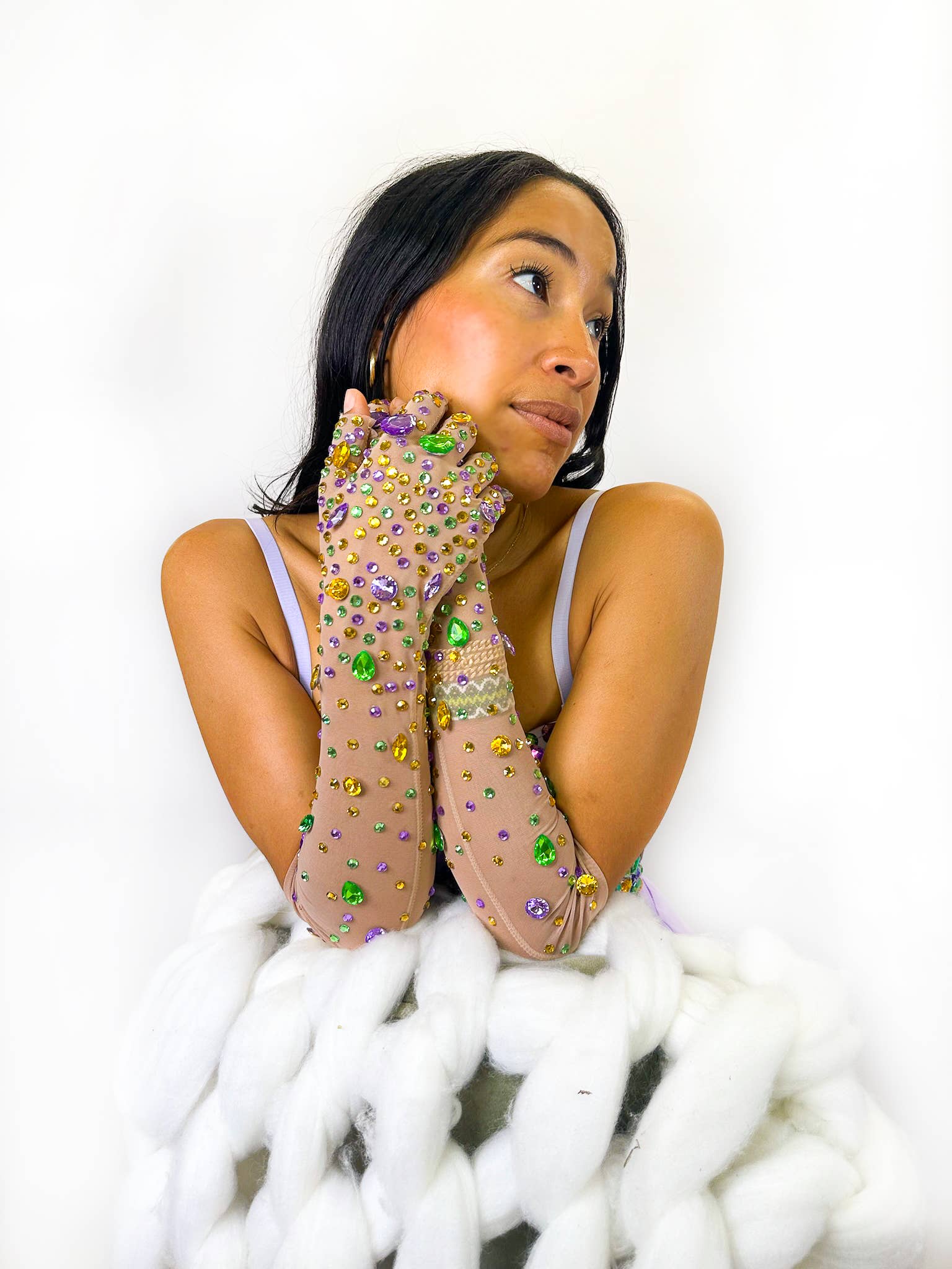 Elevate your Mardi Gras celebration with these stunning rhinestone and jewel gloves that capture the spirit of the season. Crafted with eye-catching embellishments, these gloves transform any costume into a show-stopping ensemble. The shimmering rhinestones and jewels catch the light with every gesture, ensuring you'll turn heads at parades, parties, and masquerade balls. Perfect for adding that extra touch of glamour and festive flair to your Mardi Gras look. Make a bold statement and celebrate in style with accessories that truly sparkle.