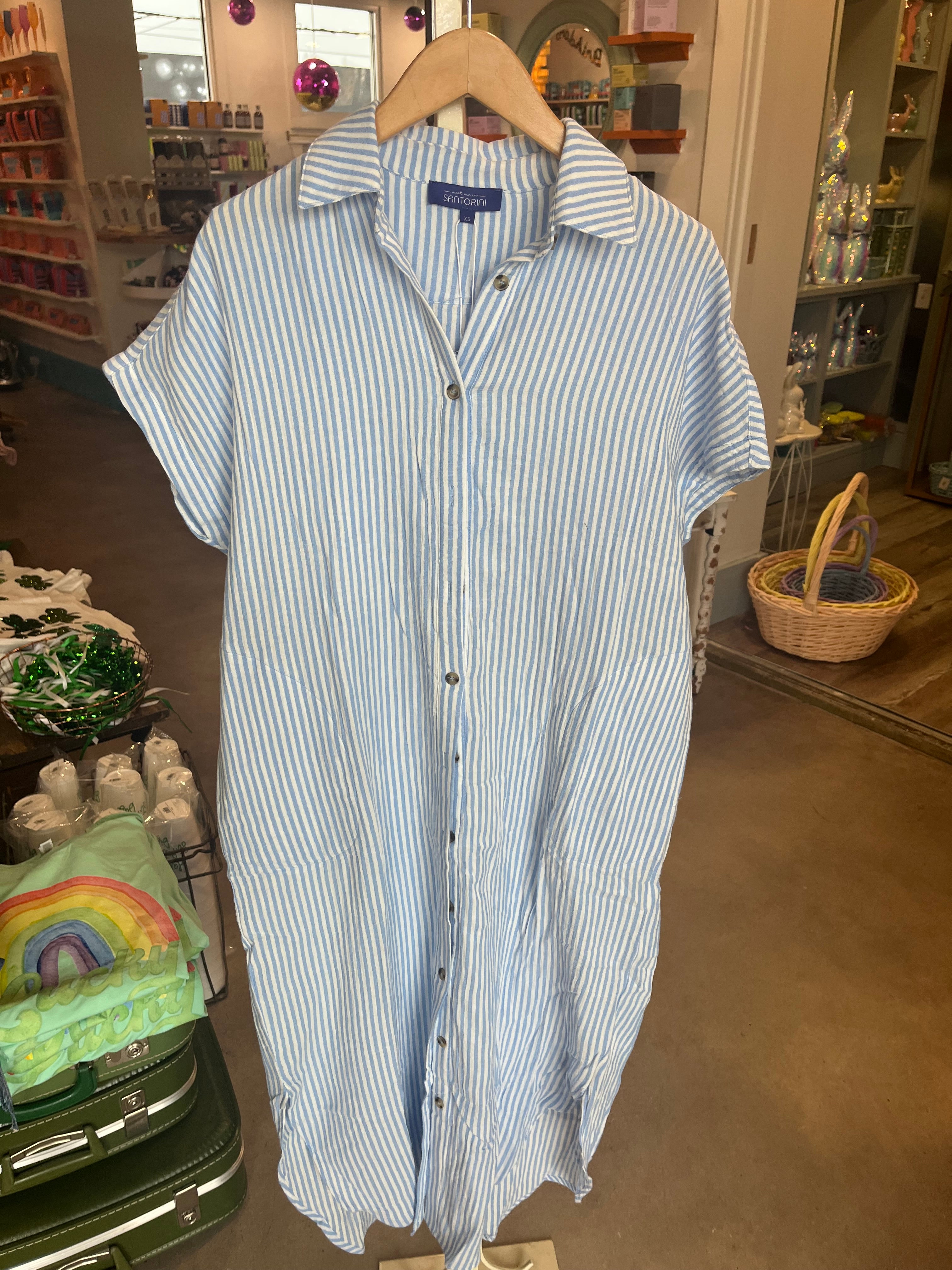 Escape to island elegance with this breezy gauze stripe shirt dress, inspired by the sun-soaked shores of Santorini. Crafted from lightweight gauze fabric, it features classic blue stripes that evoke Mediterranean charm. Perfect for warm weather adventures, casual getaways, or effortless everyday style. The relaxed silhouette offers comfort without compromising on sophistication. Ideal for layering or wearing solo, this versatile piece transitions seamlessly from day to night.