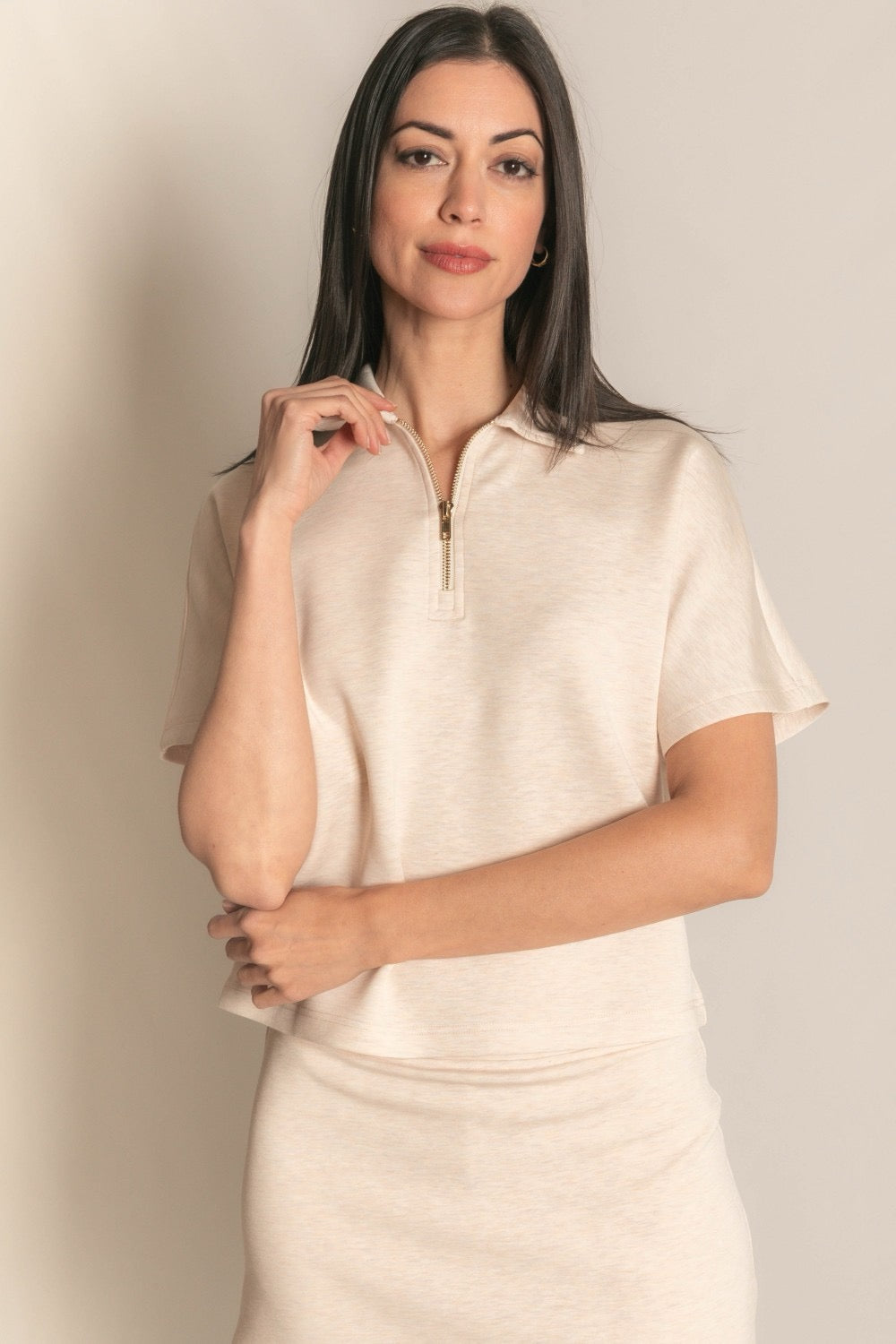 Elevate your casual wardrobe with this versatile quarter zip top in soft oatmeal. The short sleeves and relaxed fit make it perfect for layering or wearing solo on mild days. Crafted for comfort and style, this piece transitions effortlessly from weekend errands to relaxed outings. A timeless staple that pairs well with jeans, shorts, or your favorite bottoms.
