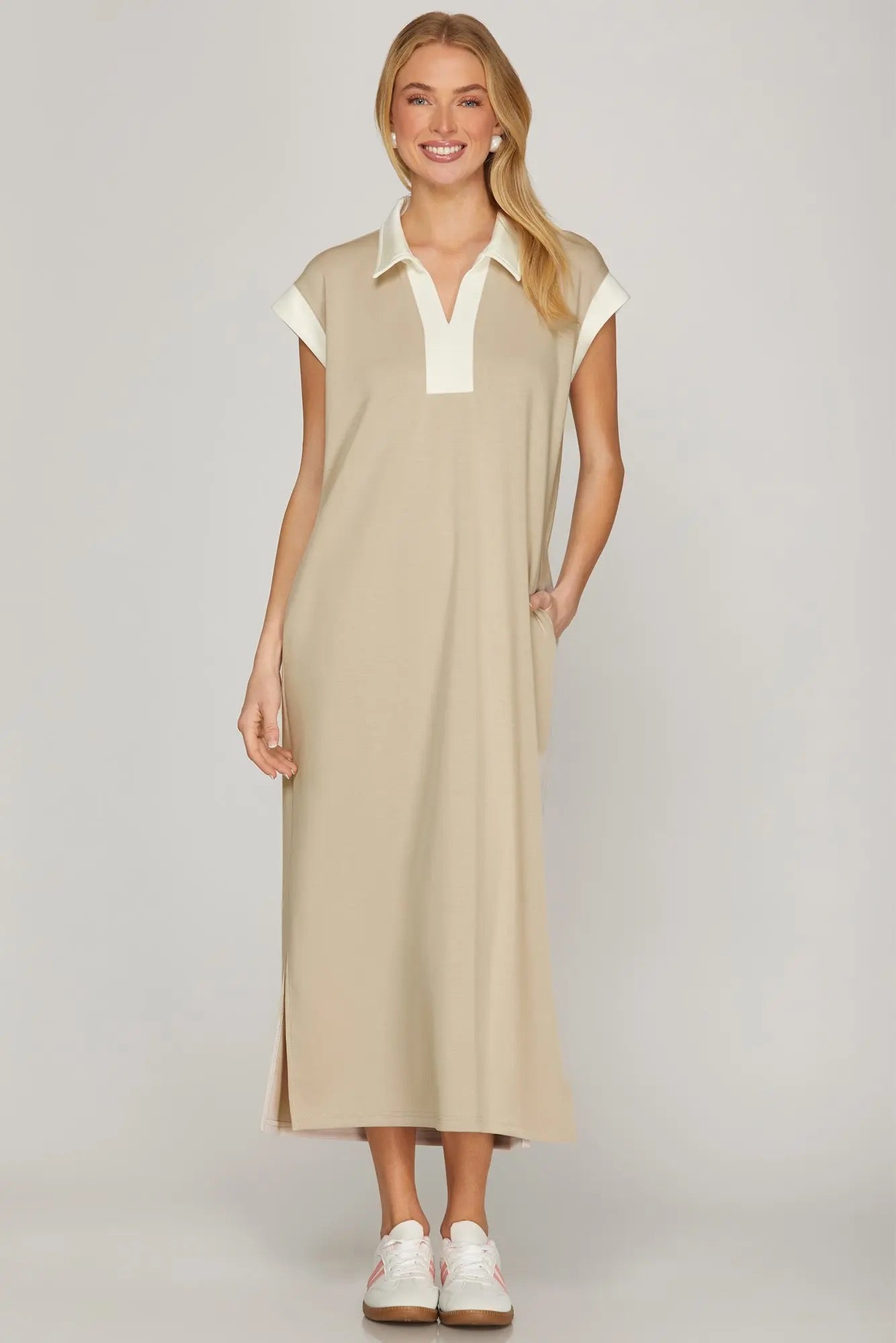 Effortless elegance meets modern comfort in this She+Sky taupe midi dress. The relaxed drop shoulder silhouette creates a flattering, laid-back vibe perfect for everything from casual outings to elevated weekend looks. The midi length offers versatile styling options—dress it up with heels and jewelry or keep it casual with sneakers and a denim jacket. The soft taupe tone is a wardrobe essential that pairs beautifully with nearly everything in your closet. Whether you're running errands or heading out for an adventure, this dress delivers understated sophistication without sacrificing comfort.