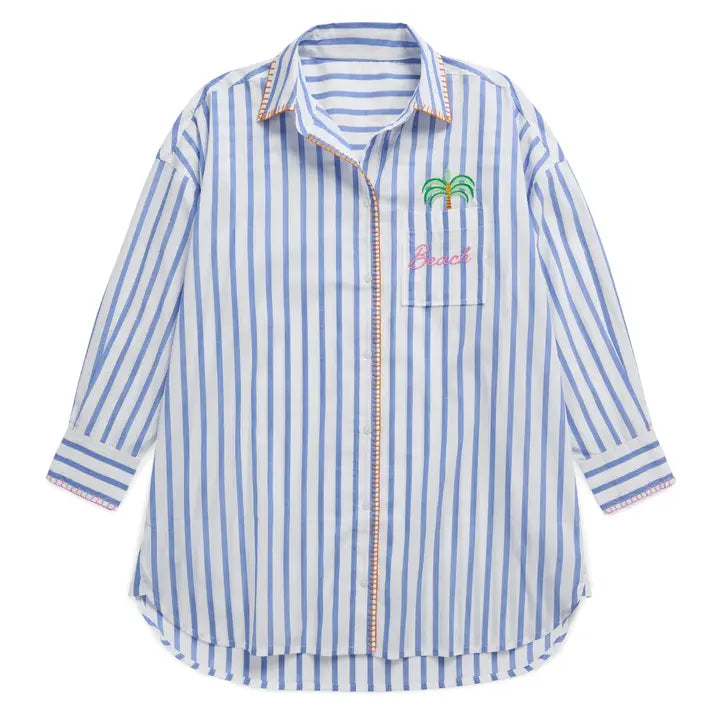 Embrace coastal vibes with this breezy cover-up shirt, perfect for lazy beach days and seaside adventures. Featuring classic blue stripes and long sleeves for sun protection, it's the ideal layer over your swimsuit. Lightweight and effortless, this summer essential captures that carefree ocean air feeling—throw it on and you're ready for the shore.