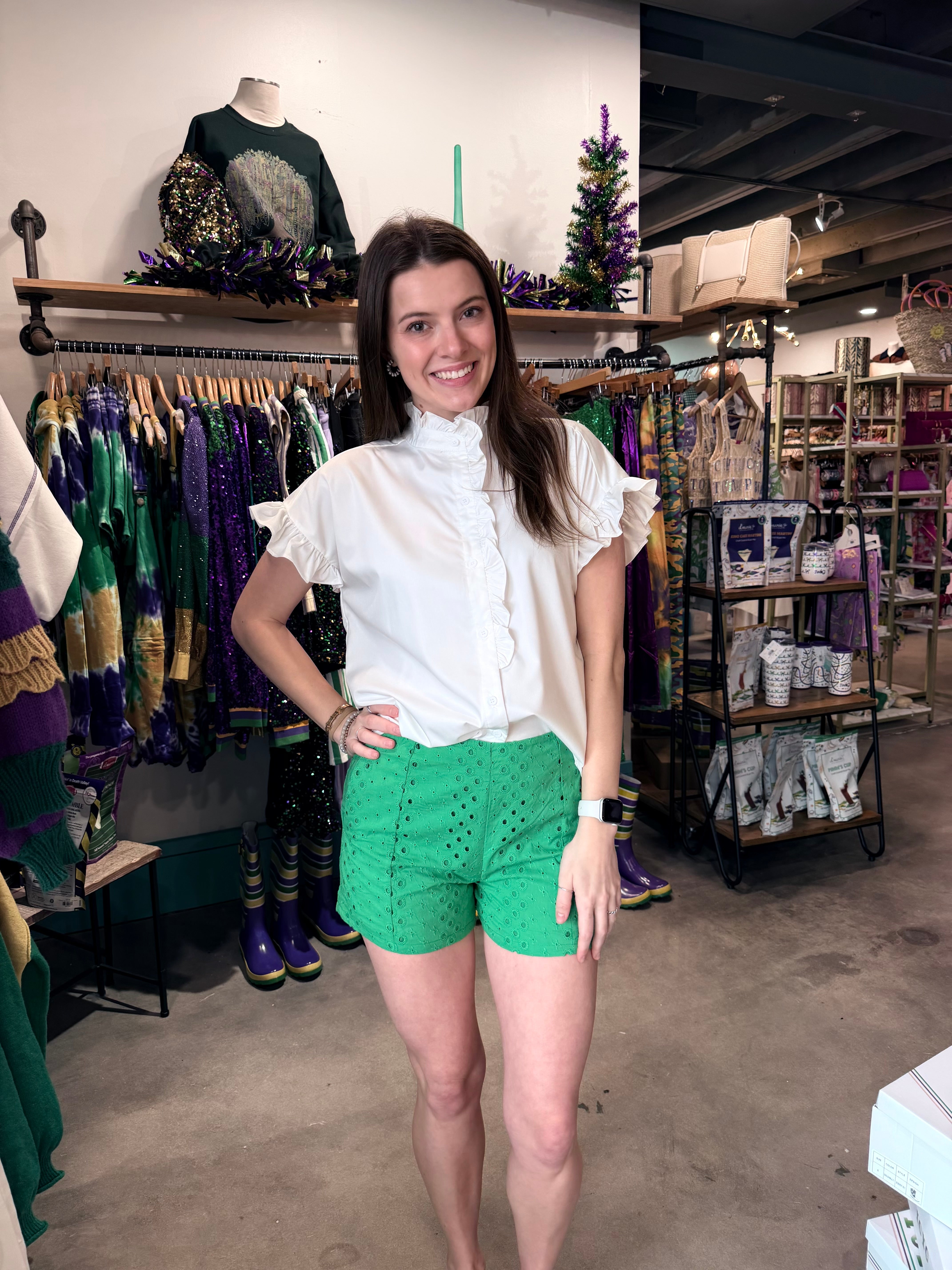 Elevate your warm-weather wardrobe with these charming green eyelet Tabitha shorts. The delicate eyelet detailing adds a touch of feminine sophistication, while the relaxed fit ensures all-day comfort whether you're running errands or enjoying casual outings. The vibrant green hue pairs effortlessly with your favorite tops and sandals, making these shorts a versatile staple you'll reach for again and again. Perfect for creating effortless, put-together looks that feel both polished and comfortable.