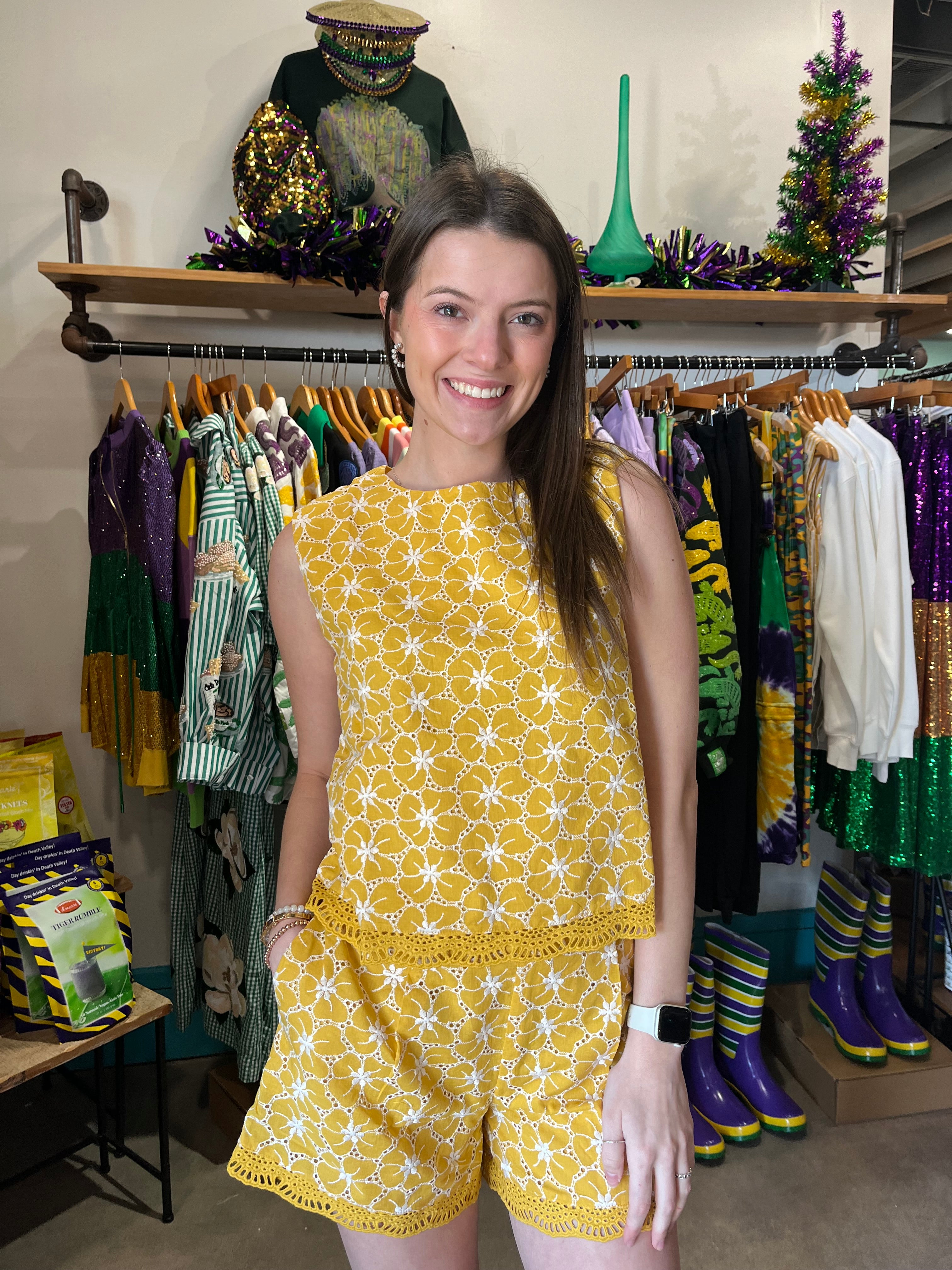 Elevate your wardrobe with this stunning sleeveless top featuring delicate yellow embroidered lace detailing. The breathable, lightweight design makes it perfect for warm weather styling, while the intricate lace adds an elegant touch to any outfit. Whether you're dressing up for a special occasion or creating a chic everyday look, this versatile piece transitions seamlessly from day to night. The flattering silhouette and timeless embroidery ensure you'll reach for this top again and again. Embrace effortless sophistication and turn heads wherever you go.