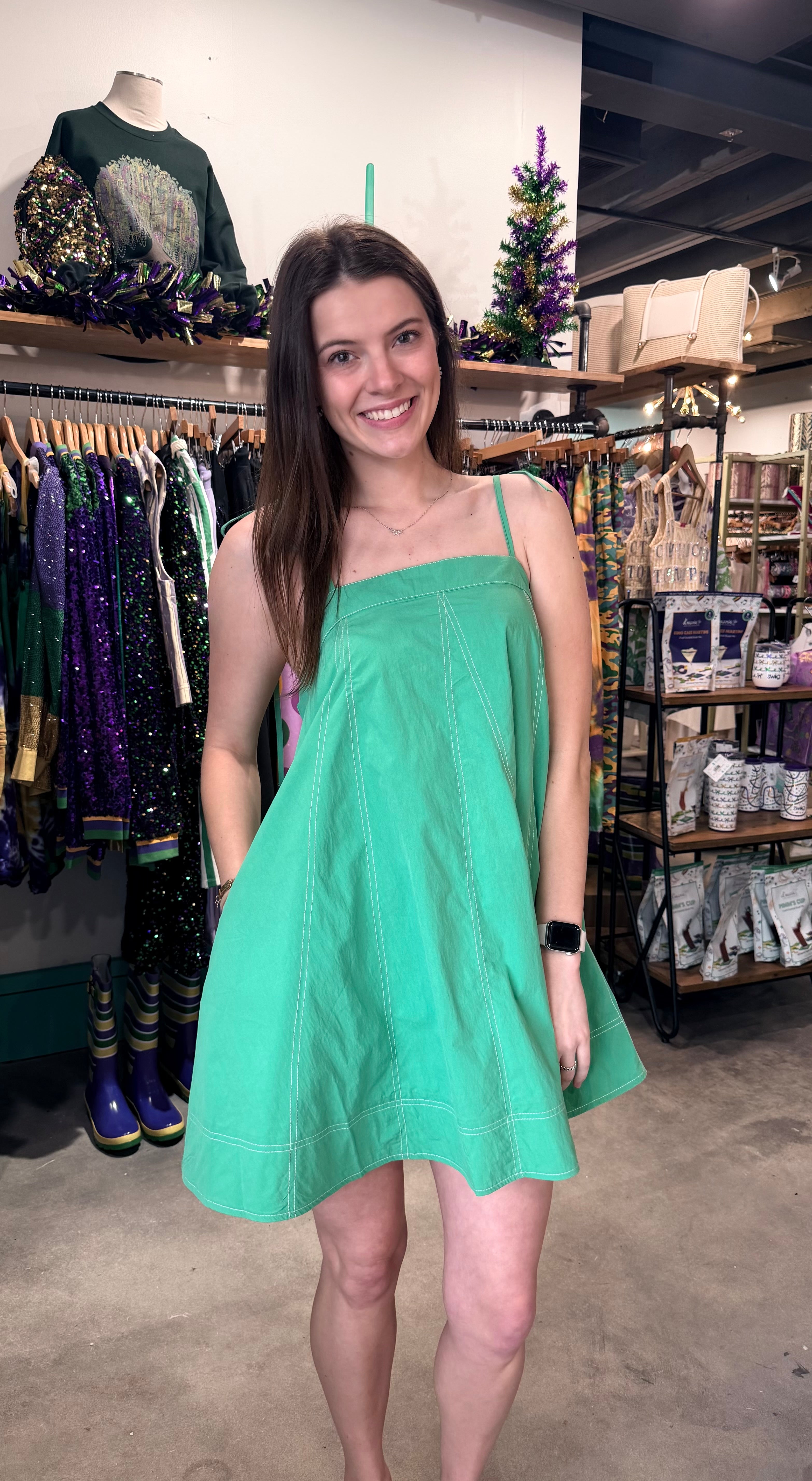 Strut into any room with confidence in this striking emerald mini dress. The bold contrast stitching adds an edgy, modern twist that elevates your look from ordinary to unforgettable. Perfect for nights out, special occasions, or whenever you want to make a statement, this dress combines vibrant color with contemporary design. The flattering silhouette and eye-catching details ensure you'll turn heads and feel absolutely fabulous. Make green your power color.