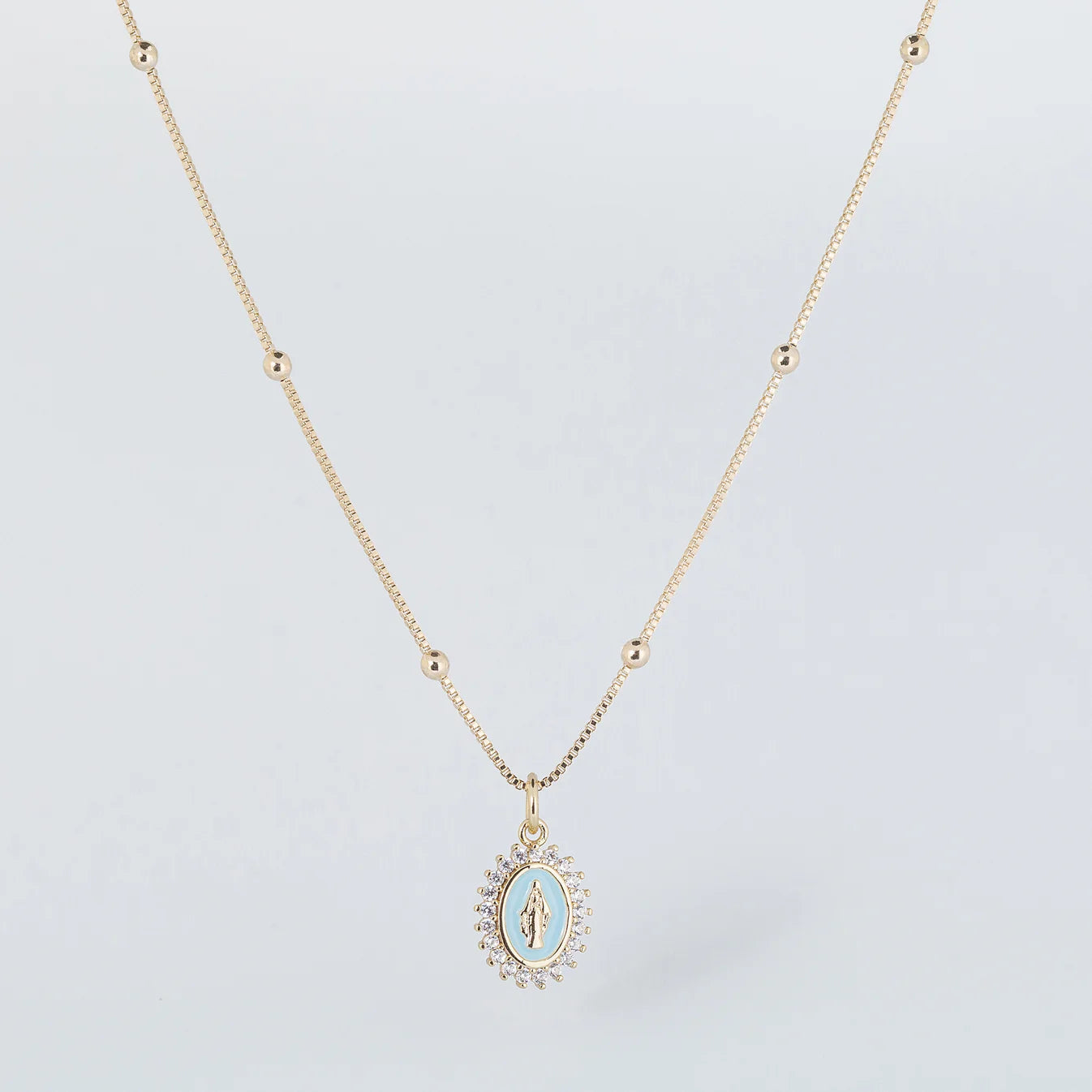 Embrace faith and elegance with the Coastal Grit Our Lady of Lourdes Necklace in soothing aqua. This delicate piece combines spiritual symbolism with a tranquil color, making it perfect for daily wear or special moments. Let its serene aqua tone inspire calm and clarity while showcasing your devotion with timeless style.