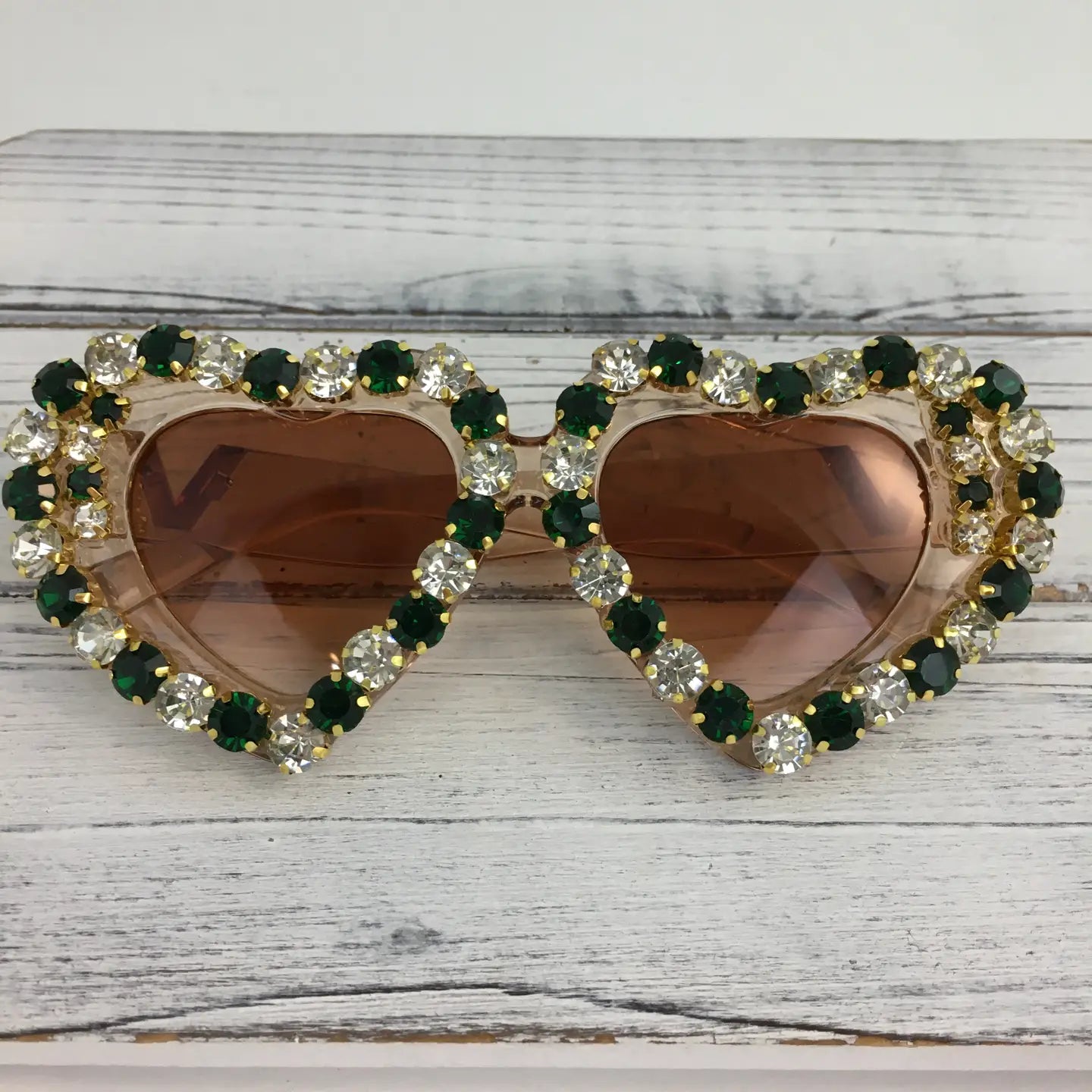 Elevate your eyewear game with these stunning green and white stone heart sunglasses. Featuring a unique heart-shaped design adorned with decorative stone accents, these shades blend playful style with UV protection. The green and white color palette offers versatility for any season, making them perfect for beach days, festivals, or everyday wear. Lightweight and comfortable, they're an instant conversation starter that adds personality to any outfit.
