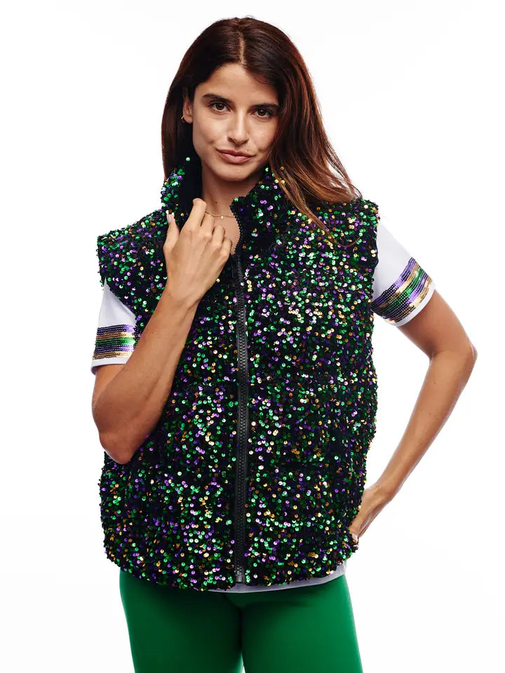 Celebrate in style with the SongLily Mardi Gras Sequin Puffer Vest, where festive flair meets comfort. This eye-catching vest features shimmering sequins in vibrant Mardi Gras colors that catch the light with every move, making you the center of attention at any celebration. The lightweight puffer construction provides warmth without bulk, perfect for layering over your favorite outfit. Whether you're hitting the parade route or dancing the night away, this statement piece delivers the glamour and comfort you need to party in confidence.