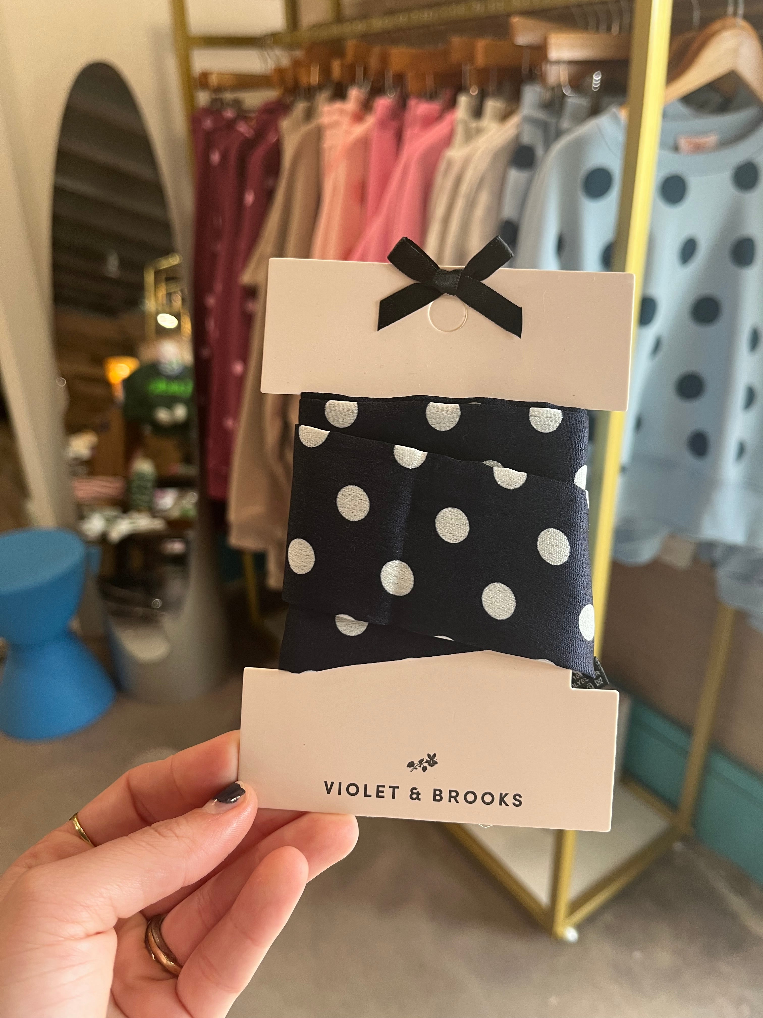 Elevate your everyday style with this navy dot skinny scarf from Violet&Brooks. The refined polka dot pattern adds visual interest to any outfit, while the slim silhouette makes it perfect for layering without bulk. Versatile enough to dress up or down, this lightweight accessory ties effortlessly around your neck, as a headwrap, or styled through a belt loop. An essential piece for building a timeless wardrobe.