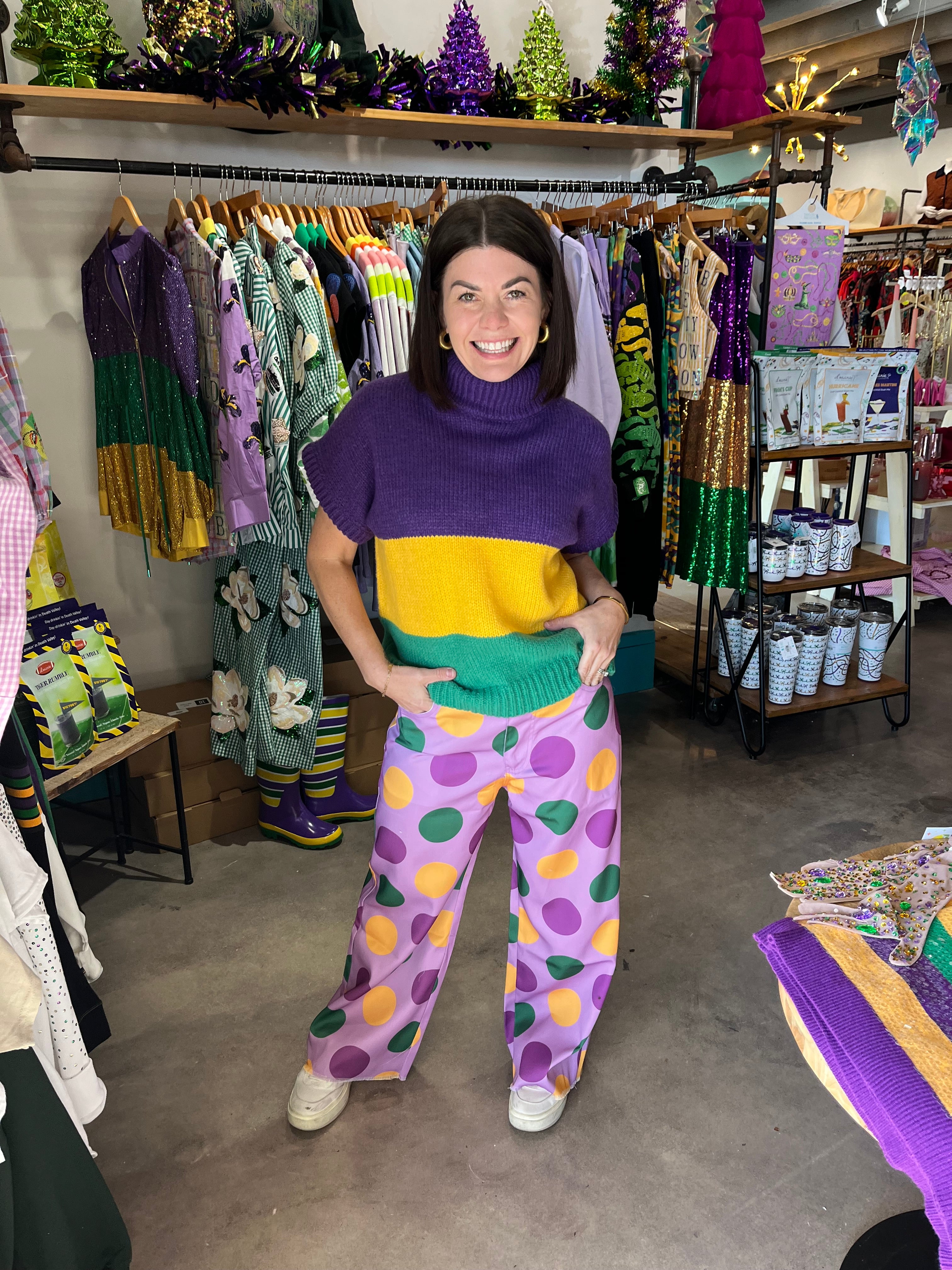 Celebrate bold style with LovLov's Mardi Gras Polka Dot Trouser Pants—a vibrant statement piece that transforms any outfit. The classic polka dot pattern brings playful sophistication to your wardrobe, while the tailored trouser silhouette ensures a flattering, polished fit. Perfect for festive occasions or when you want to add personality to everyday wear, these pants deliver eye-catching flair without compromising comfort. Make every moment memorable with a design that commands attention and sparks conversation.