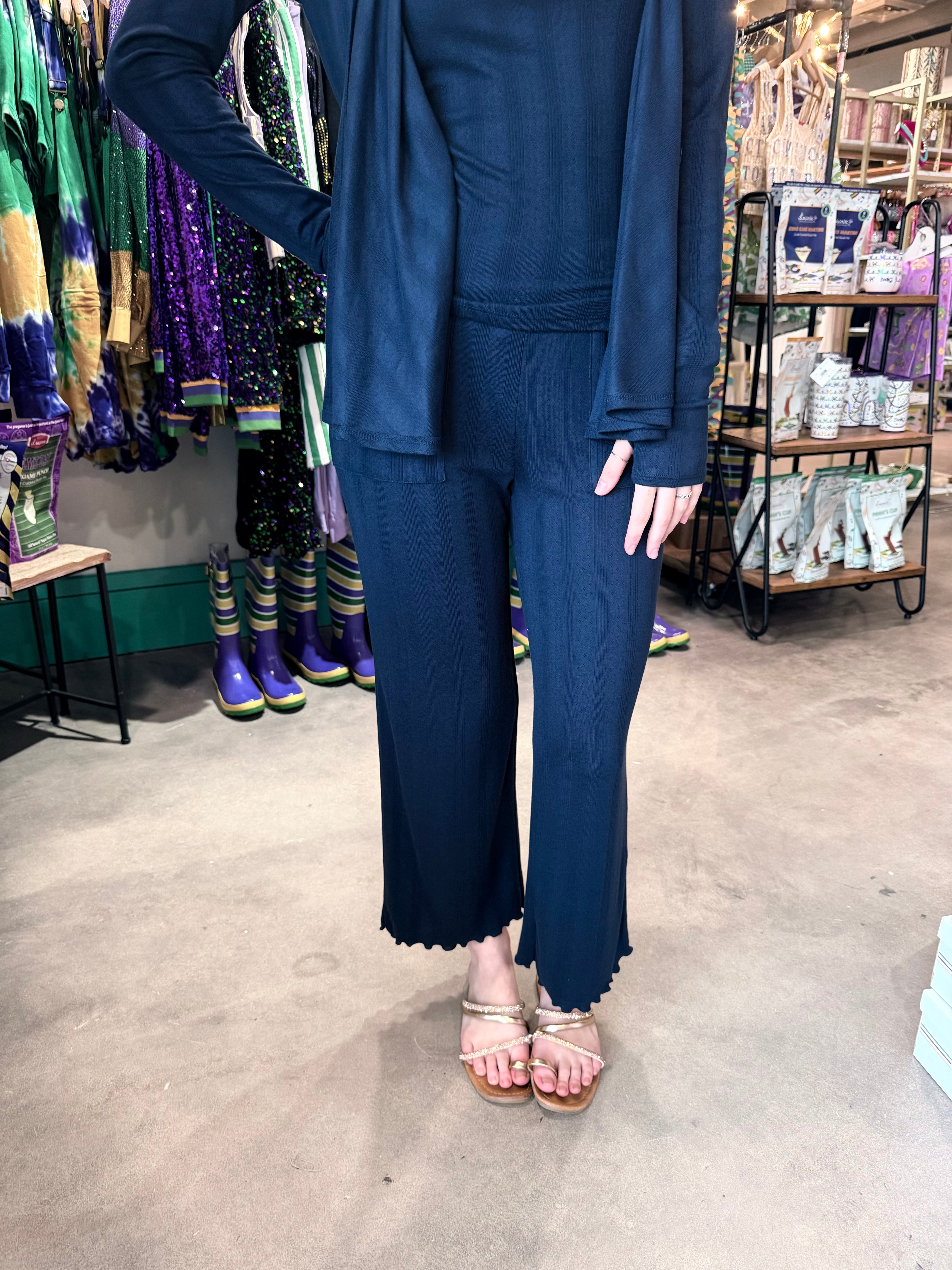 Elevate your casual wardrobe with these Softies Midnight Cropped Pants, designed for effortless style and comfort. The sleek midnight hue pairs perfectly with any top, while the delicate lettuce edge trim adds a playful, feminine touch that sets them apart. Crafted from soft, breathable fabric, these cropped pants offer the ideal length for showcasing your favorite footwear while providing all-day wearability. Whether you're dressing up for brunch or keeping it relaxed on the weekend, these versatile pants deliver both sophistication and charm in one flattering silhouette.
