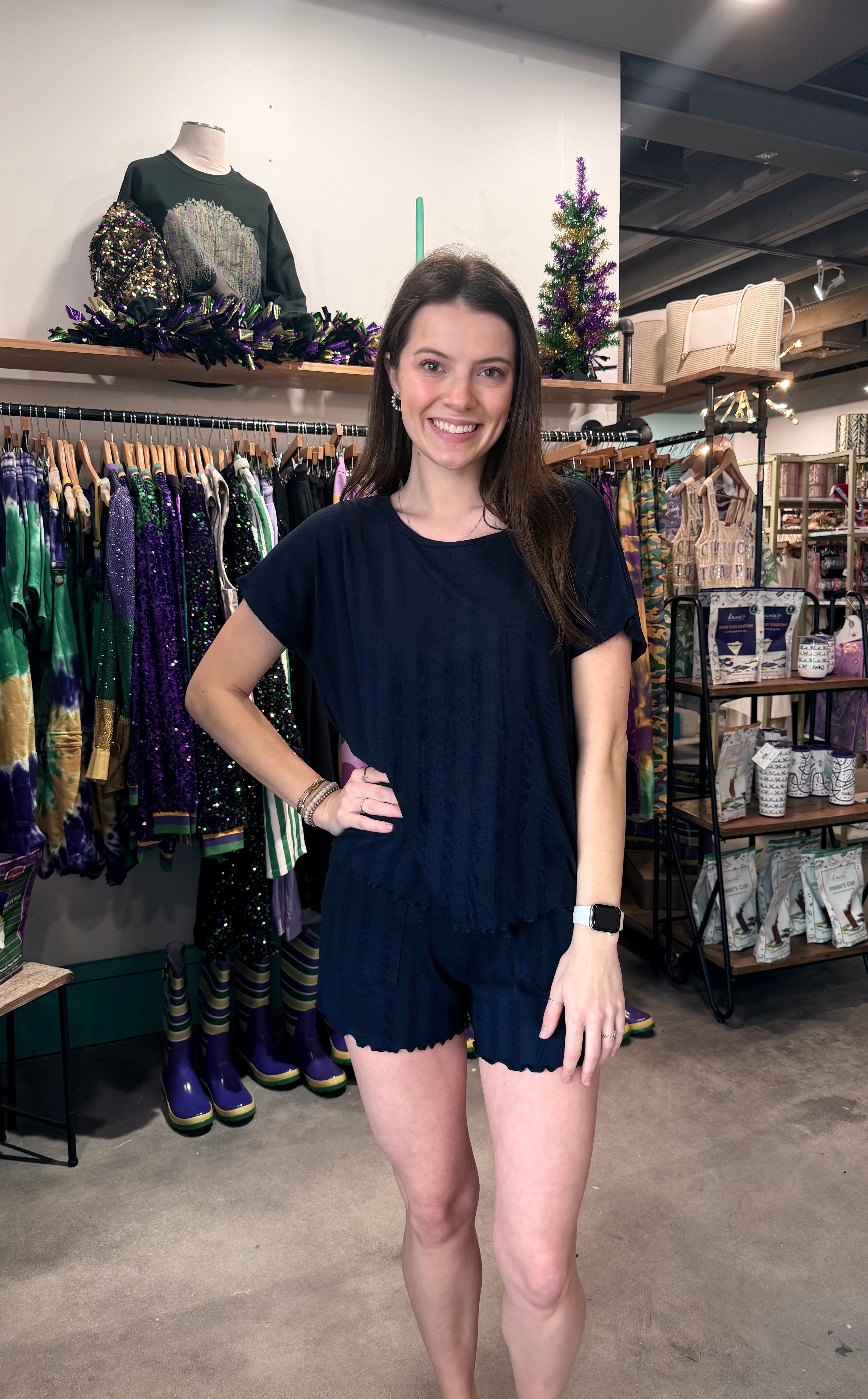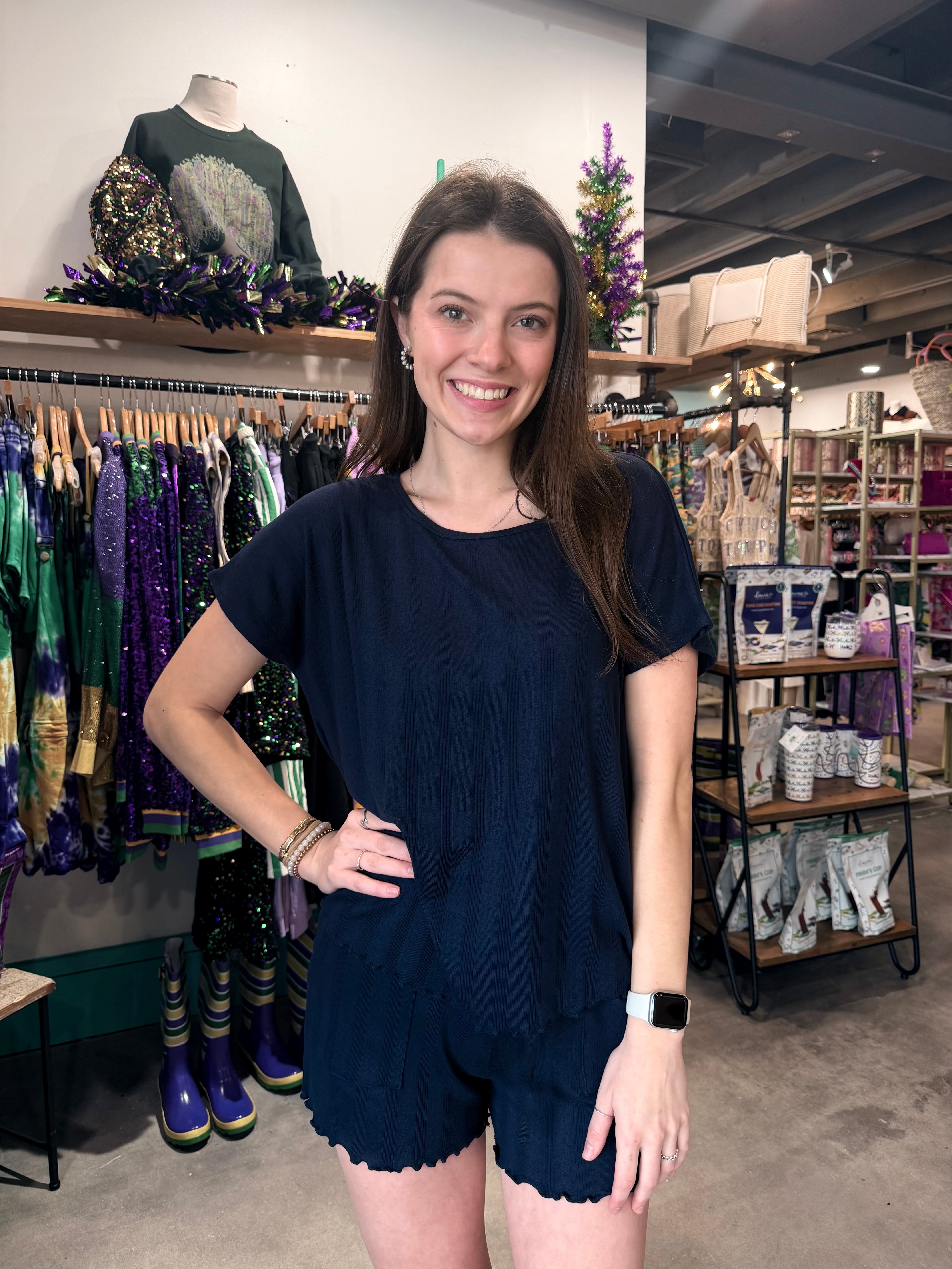 Sink into effortless comfort with our Softies Midnight Slouchy Tee. This relaxed-fit essential features a flattering lettuce edge trim that adds a delicate, feminine touch to an otherwise laid-back silhouette. The deep midnight hue pairs seamlessly with everything in your wardrobe, making it the perfect go-to piece for casual days when style shouldn't require effort. Soft, breathable fabric keeps you comfortable from morning to night.