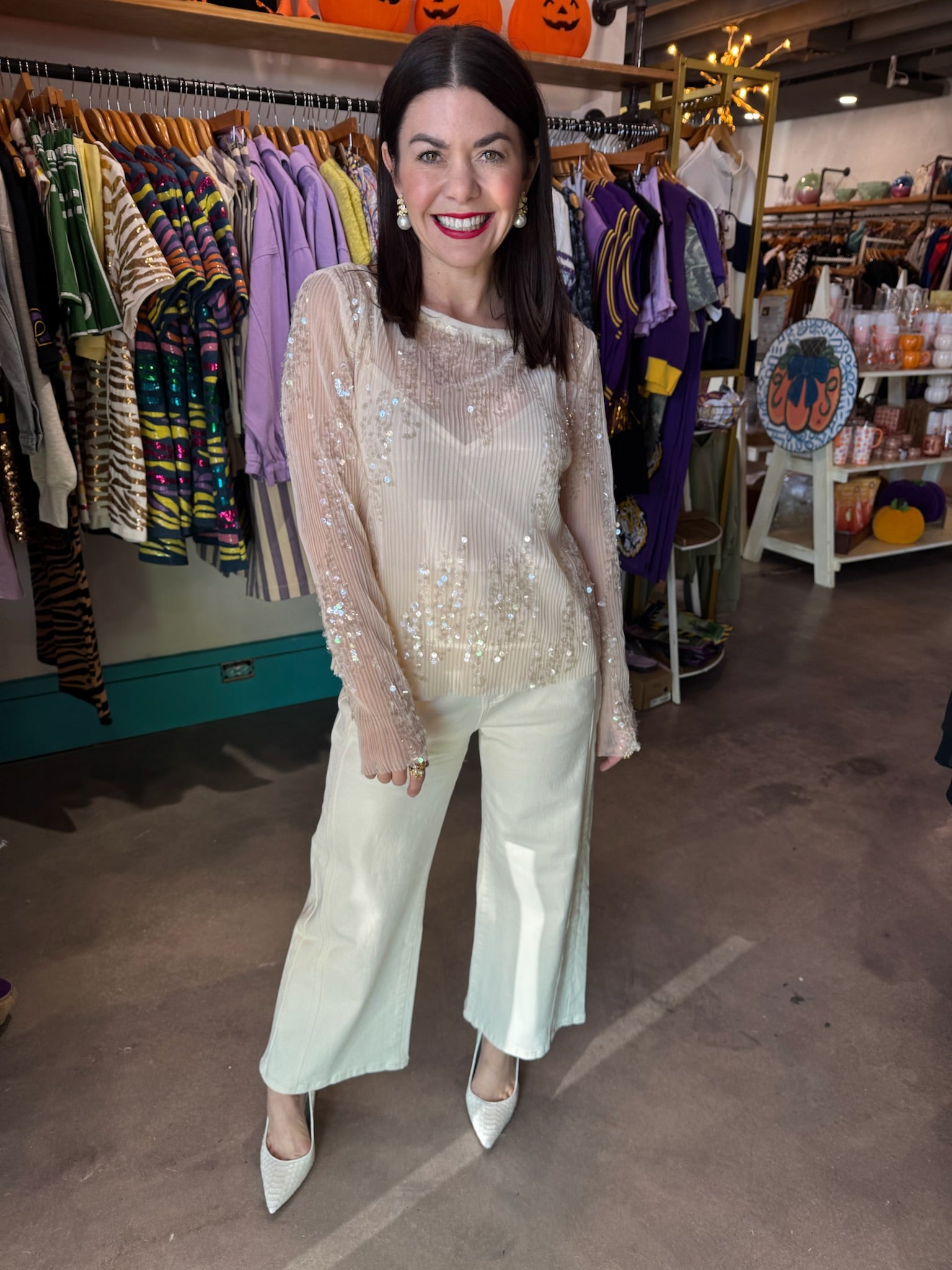 Elevate your style effortlessly with the Lucy Paris Cream Ginny Sequined Top. This long-sleeve top combines luxurious cream fabric with shimmering sequins for a sophisticated sparkle that catches every eye. Perfect for evening events or upscale gatherings, it offers both comfort and glamour, making you stand out with ease. Enhance your wardrobe with this versatile piece that pairs beautifully with skirts or tailored pants for a polished, radiant look.